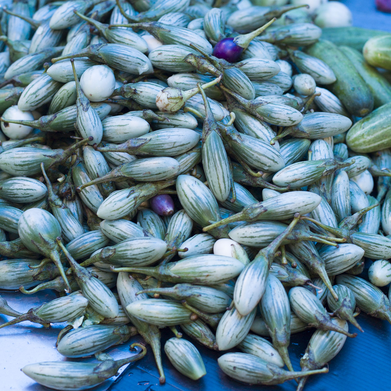 Najmniejszy z całej rodziny jest bakłażan groszkowy, który jest też dosyć gorzki. Poczatkowo nawet myślałem, że to jakaś odmiana pieprzu, bo nieco przypomina świeży zielony pieprz i często sprzedawana jest w małych torebkach, tak jak rzeczony pieprz. Najpopularniejsze są odmiany biało-zielone (kulista i podłużna) i fioletowe – można je jeść na surowo (co robię praktycznie codziennie) albo w curry, zupie etc. Zielona, podłużna odmiana jest łagodna i nieco słodka, więc dobrze nadaje się do mniej pikantych curry.