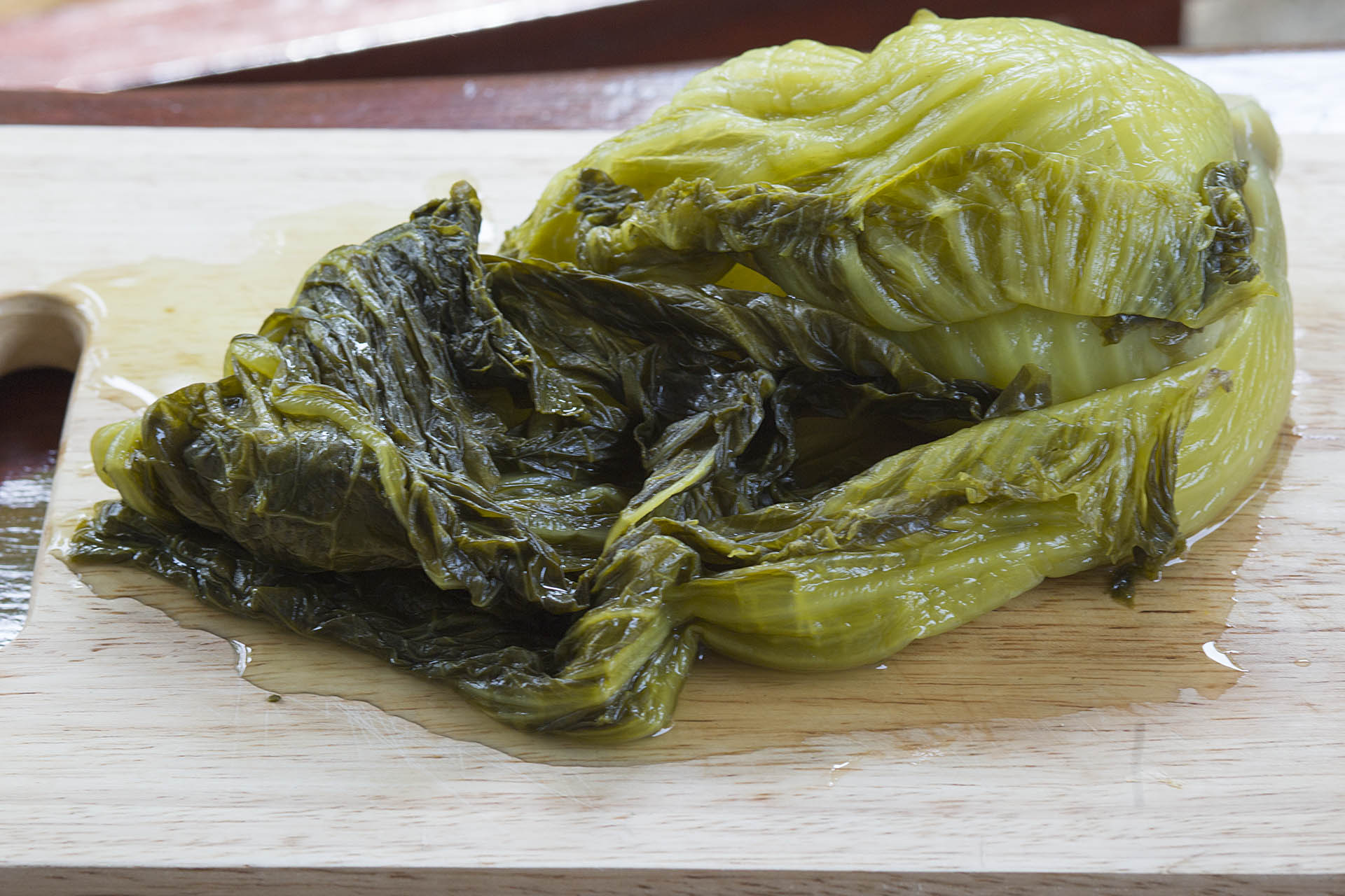 Na stoisku warzywnym, które odwiedzam praktycznie codziennie, kupiłem dziś lokalne kiszonki. Na razie tylko dwa rodzaje: bambus (mai phai) i jakaś odmiana kapusty (pak got), możliwe, że kapusta chińska – bok choy.
