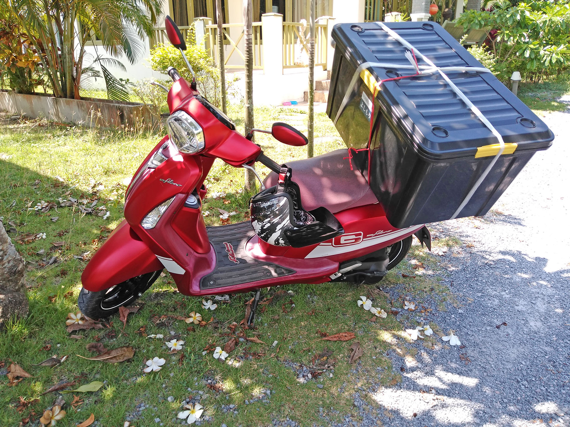 Co prawda pojechałem z założeniem, że kupię skrzynię i zamówię transport do domu, ale na miejscu okazało się, że sklepowy pick-up akurat jest w Surat Thani. Pani sklepowa obejrzała skuta i nic sobie nie robiąc z moich “motosaai ni lek lek!” (to jest bardzo mały motocykl!), zawołała umyślnego, który zmyślnie przywiązał skrzynię do bagażnika, uprzednio podłożywszy pod nią kawałek kartonu, żeby nie uszkodzić siedzenia. I tak, nieco ślepy, bo skrzynia zasłaniała lusterka, pojechałem do domu. Z pełną skrzynią byłoby ciężej, a tak motosaai stawiał tylko nieco większy opór powyżej 40 kmh.