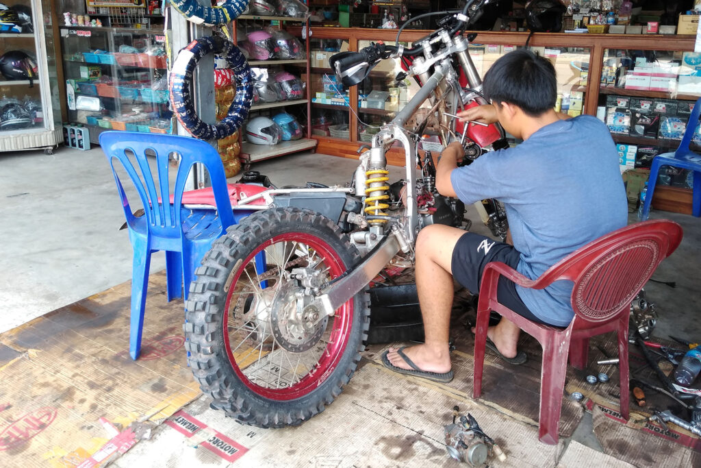 Byłem już przygotowany na to, że jutro rano zapakuję go na dach autobusu (opcja znacznie tańsza niż wynajęcie pick-upa z kierowcą) i w ten sposób wrócimy do VTE. Natomiast mój mechanik nie podawał się do końca i dzisiaj popołudniem udało mu się nie tylko złożyć cały motor do kupy, co było nie lada wyzwaniem, bo rano XRka wyglądała jak niżej, ale też uruchomić go i nawet klika km pojeździć.
