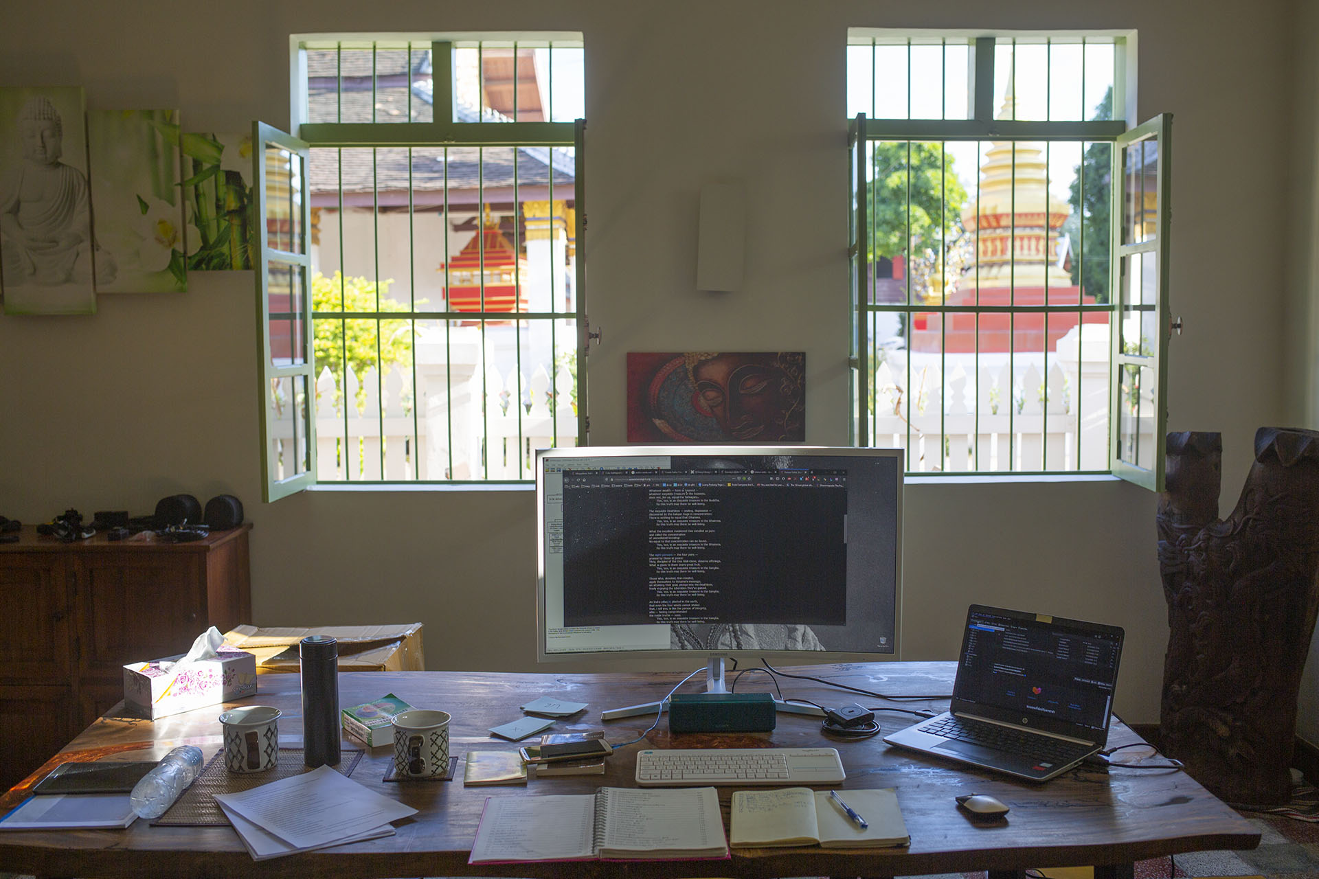 I tak dałem sobie spokój z poszukiwaniem transliteracji tutejszych świątynnych tekstów na angielski – co, zresztą, było z góry skazane na niepowodzenie, bowiem jak są – co prawda – gotowe zestawy książkowe, które można kupić w sklepach z akcesoriami dla mnichów i praktykujących świeckich, tak nieco większe świątynie przygotowują własne, nieco odmienne (i zmieniają je co jakiś czas). Teraz więc podczas wiecznych ceremonii staram się nadążyć za mnichami czytając palijskie teksty zapisane w alfabecie laotańskim. Pożyczyłem też książkę tekstów z pięknej Wat Pha Phai, gdzie jest kilku anglojęzycznych mnichów, którzy służą mi radą oraz wskazówkami, i w wolnych chwilach trenuję czytanie laotańskiego na suttach.