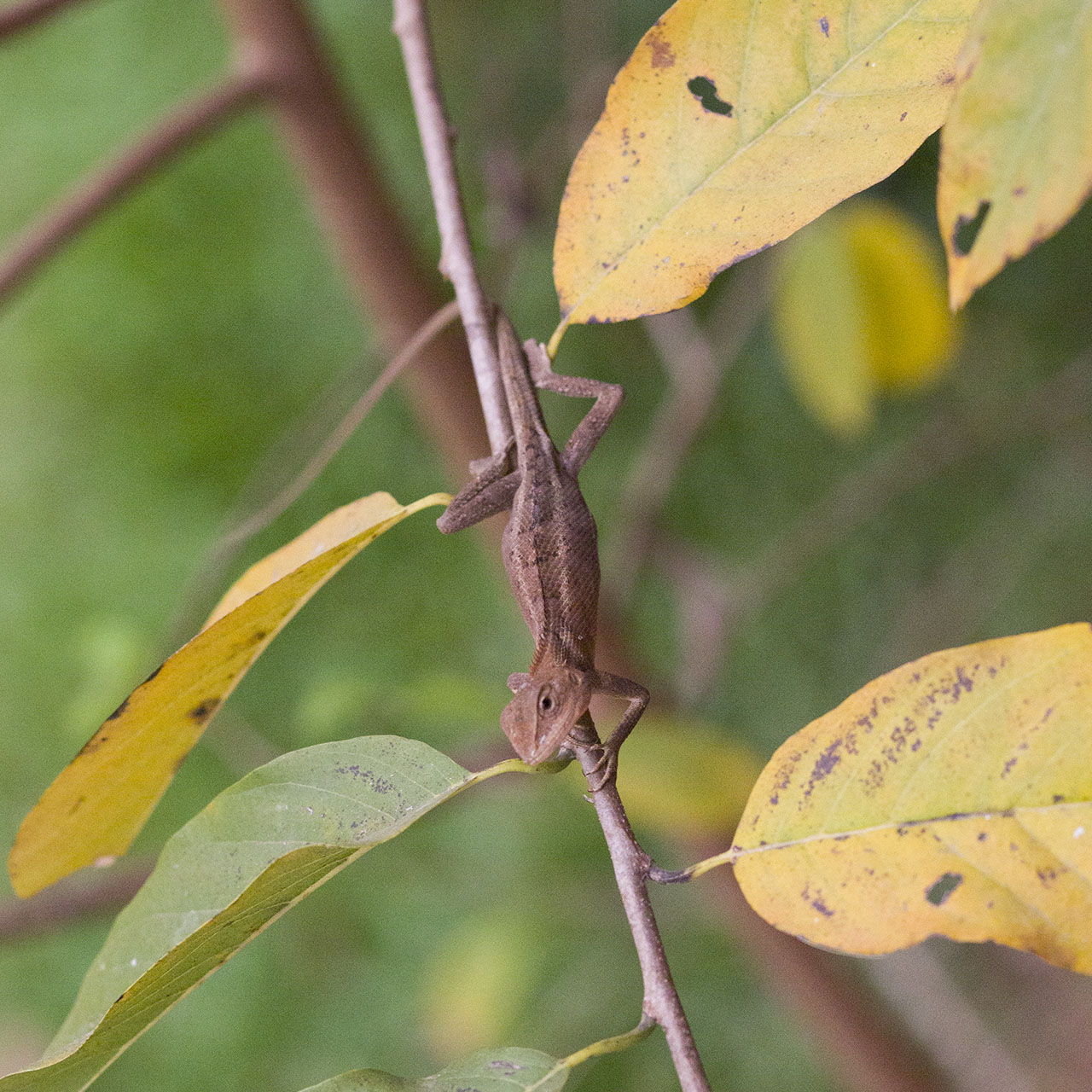 Poza stadami małych gekonów, w laotańskich ogrodach można natknąć się na jaszczurki ogrodowe (łac. Calotes Versicolor). Są niesamowicie szybkie i ciężko je sfotografować, ale wczoraj mi się udało. Ta ze zdjęcia to młody okaz, starsze mają na grzbiecie kryzę i o wiele większe głowy. Bardzo różnią się też kolorami.