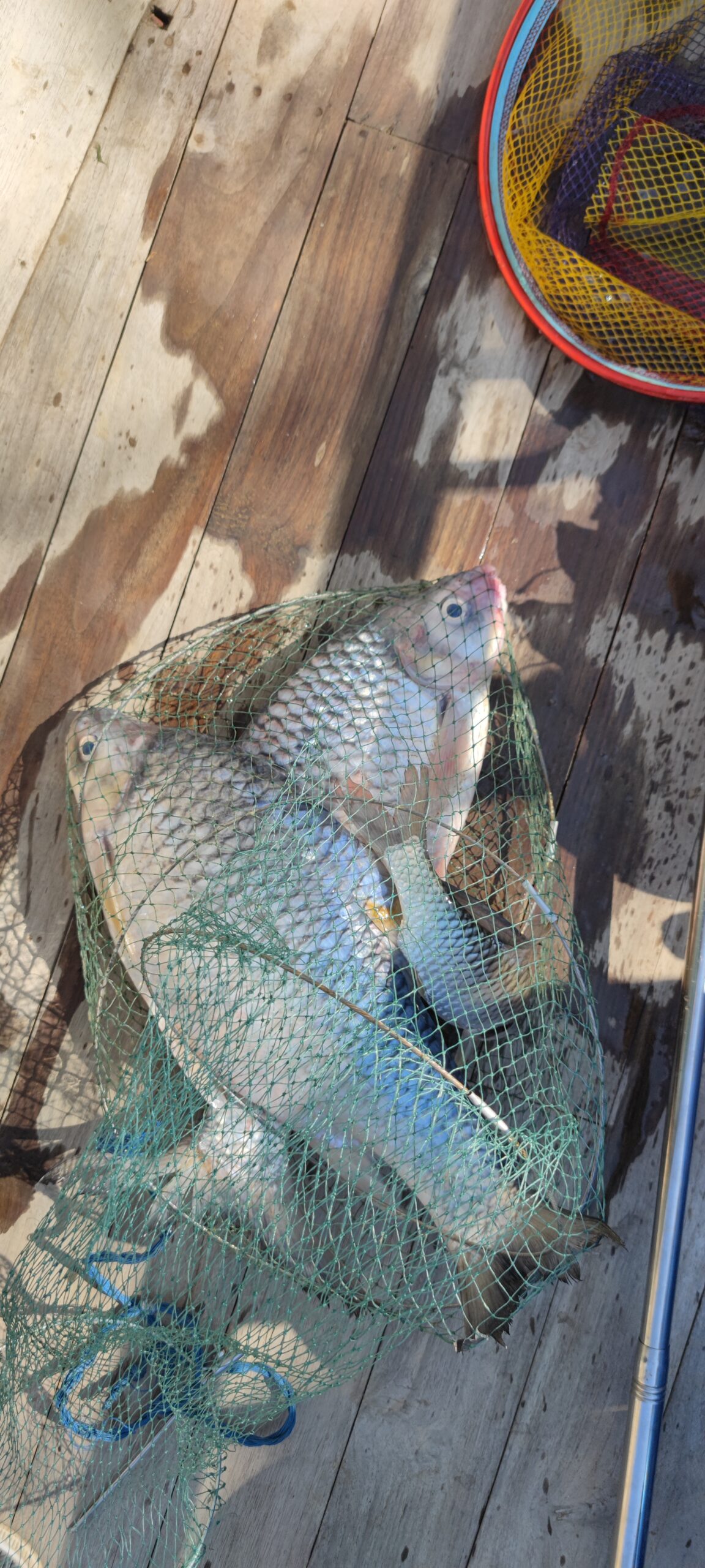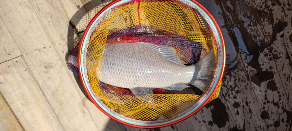 Zawróciliśmy więc i popłynęliśmy w dół rzeki na działkę A., gdzie właśnie zaczynały się prace nad budową domu. Miałem więc masę czasu na łowienie ryb – początkowo efekty były takie sobie, ryby co prawda już do zjedzenia, ale wciąż bardzo małe w porównaniu z tym, co lokalni rybacy wyciągają z sieci. Poniżej zdjęcie porównawcze – te duże okazy to te z sieci.