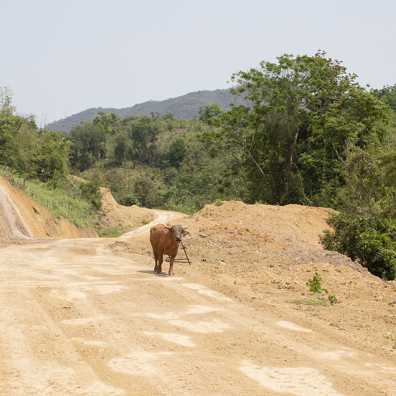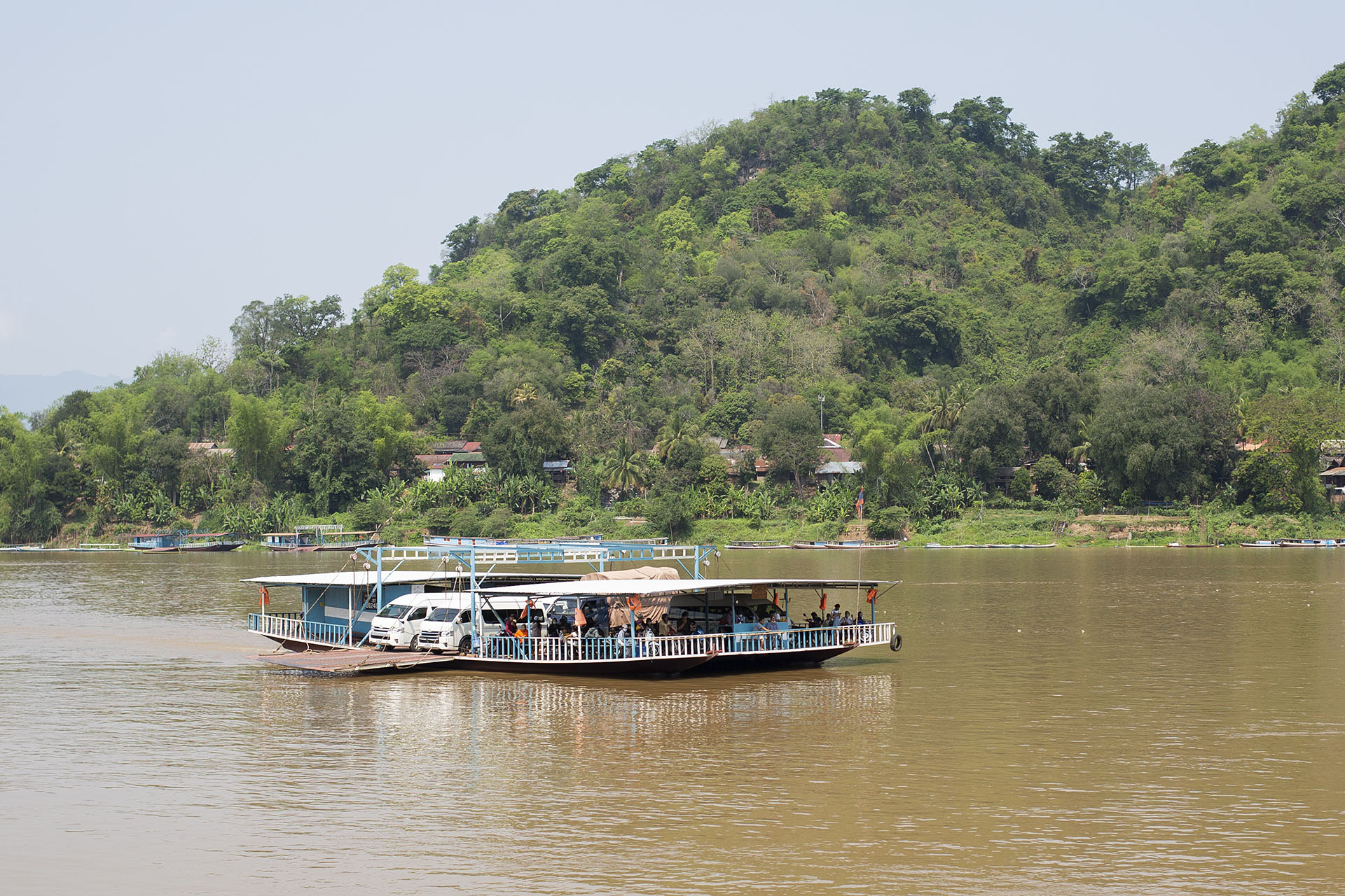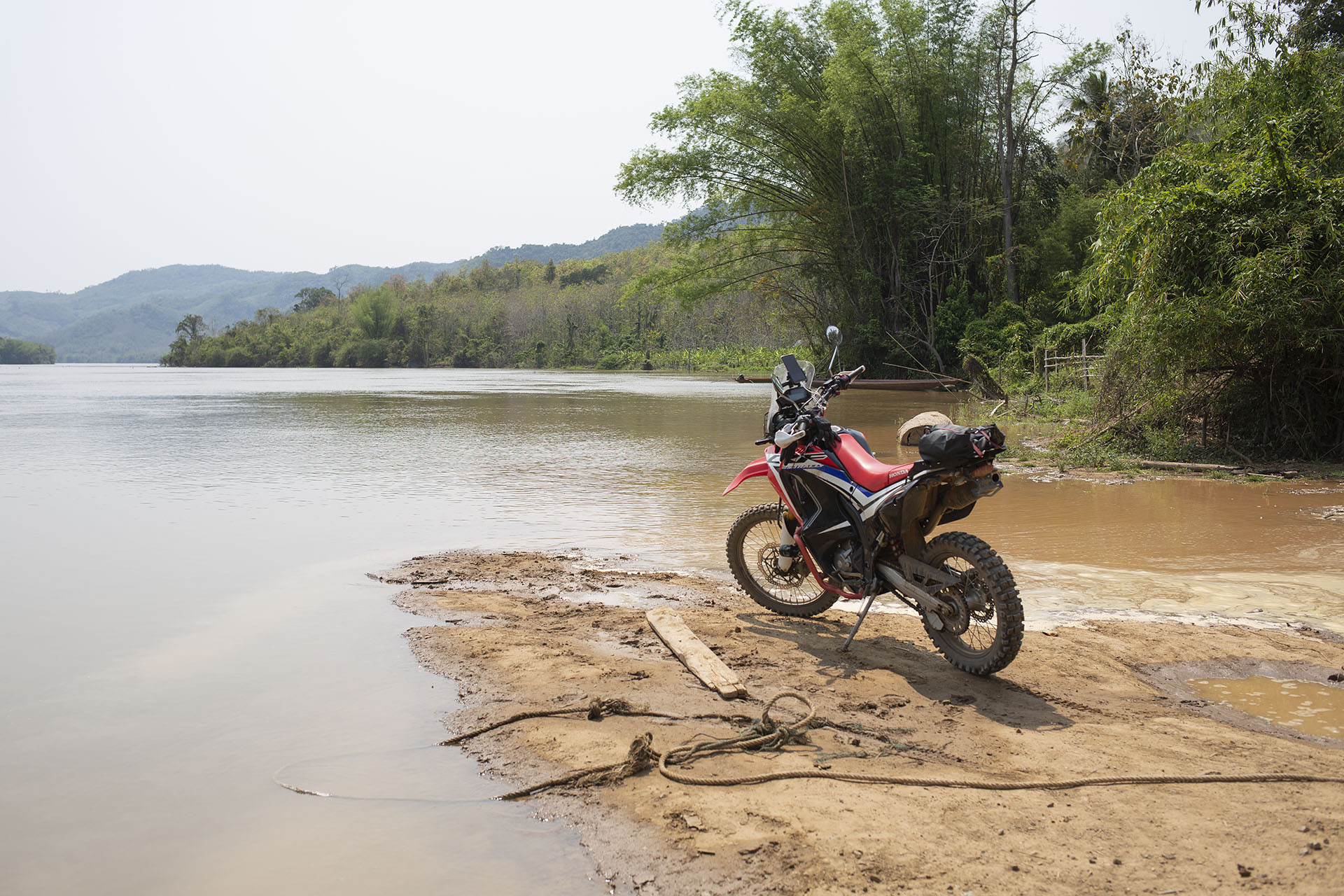 Co nie zmienia faktu, że pętla jest zróżnicowana i bardzo piękna. Najpierw przejazd przez półwysep w Luang Prabang, potem prom do Chomphet. Następnie kilka km do Ban Bhoumlao, gdzie na rondzie odbijamy na zachód i bardzo dobrej jakości krętą drogą przez góry jedziemy do wsi Nakhai. Tam zjeżdżamy z drogi, pokonujemy całkiem spory strumień (właściwie to już małą rzekę) i przeprawiamy się przez góry aż na Mekong. Tam ładujemy motor na łódź i przeprawiamy się. Dalej wzdłuż rzeki: najpierw bardzo fajną szutrową drogą, na której można ładnie rozpędzić motor, a potem – od zjazdu do wodospadu Khuang Si – już krętą asfaltową drogą z powrotem do LPQ.